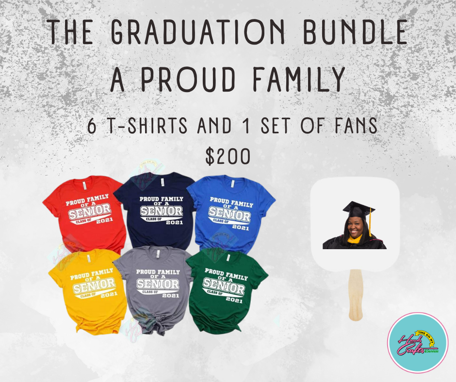 Celebrate your graduate with our Proud Family Graduation Bundle! This bundle includes 6 t-shirts and 1 set of fans to show off their achievement. Made with high-quality materials, these items are the perfect way to commemorate this special milestone. Join in on the celebration and show off your pride for the graduate. Additional t-shirts can be added for $10.