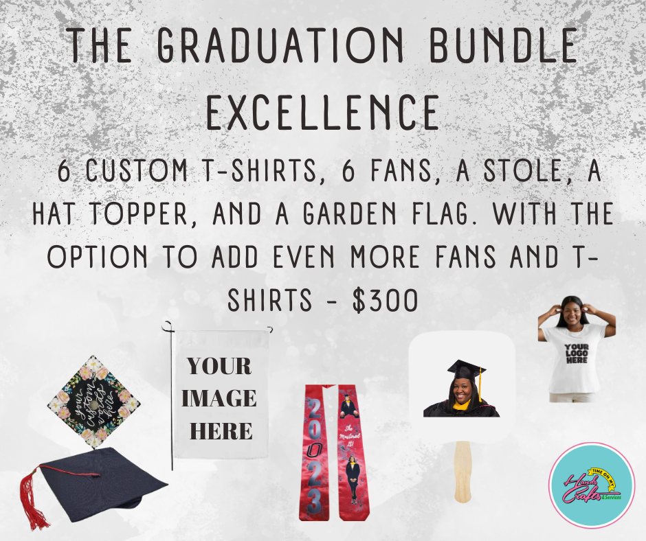 The Graduation Bundle - Excellence is the perfect package for any graduate. It includes 6 custom t-shirts, 6 fans, a stole, a hat topper, and a garden flag. With the option to add even more fans and t-shirts, this bundle is the ultimate way to celebrate your achievement.